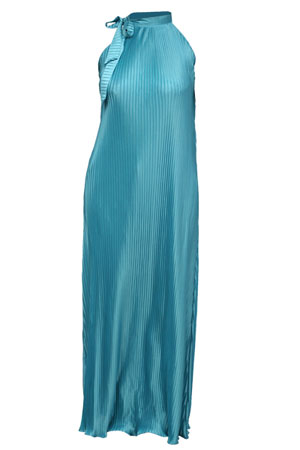 Rochie de seara turcoaz de la Tara Fashion, 139, 93 lei. Rochie, fara maneci, lunga, din saten plisat, lejera. Are o funda la decolteu gat.