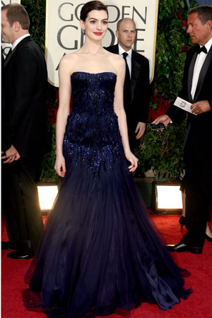 Nominalizata la premiul pentru cea mai buna actrita, Anne Hathaway a fost o aparitie fermecatoare, purtand o creatie albastru roial de la Armani Prive.