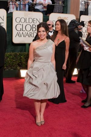 America Ferrera, nominalizata la premiile Globul de Aur pentru rolul sau din varianta new-yorkeza a lui Betty cea urata, a purtat o tinuta compusa din pantofi decupati Jimmy Choo si o rochie de seara marca Oscar de la Renta.