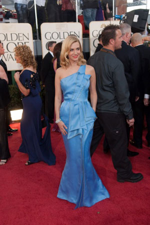 January Jones, nominalizata la Globurile de Aur pentru rolul din serialul Mad Men, a purtat o rochie bleu ciel creata de Versace.