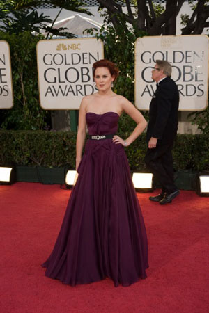 Rumer Willis, fiica lui Demi Moore si a lui Bruce Willis, a fost numita Miss Golden Globes, facandu-si aparitia intr-o rochie violet inchis creata de Reem Acra.