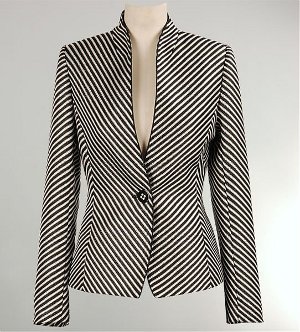 Sacou elegant cu joc de dungi alb-negru de la YOKKOSacou elegant, fara guler, cu passepoil negru pe cant, cu decolteu adanc.