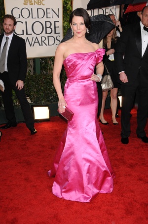 Lauren Graham, vedeta serialului Parenthood, a optat pentru o rochie roz din satin ce aminteste de creatiile anilor ’80. Rochia cu umerii goi urmareste linia corpului iar detaliile din zona bustului incearca sa distraga atentia dinspre talie spre decolteu eviidentiind o silueta de clepsidra. Nu putem sa nu mentionam ca materialul pretentios precum si culoarea aleasa ar fi avut nevoie de un model putin mai simplu funda prinsa de decolteu incarcand rochia.