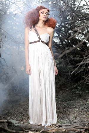 Aceasta rochie superba de inspiratie greceasca poate fi alegerea perfecta pentru cel mai important moment din viata ta. Linia bustului si talia sunt puse in valoare de corsetul fin drapat. Element distinctiv, curelusa cu inele din argint prinsa pe un singur umar, este accesoriul special care defineste imaginea unei rochii de vis.