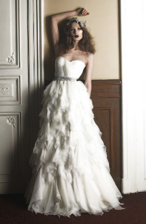 O rochie de mireasa care pune in valoare o silueta subtire. Corsetul este imbracat in voal. Simplu si fin contrasteaza placut cu fusta rochiei ampla, realizat din volane multiple suprapuse. Talia este subliniata de o curea subtire, pretioasa.Toate rochitele sunt disponibile pentru vanzare pe siteul www.mlh-shop.com cu livrare gratuita in 3 zile.