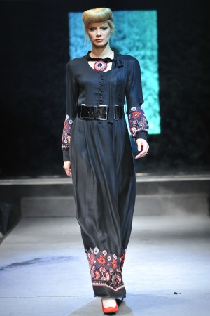 Rochia este piesa dominanta a colectiei. Realizata din matase nu lipsesc-i detaliile fine: broderiile si centura lata care accentueaza talia.