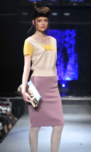 O tinuta in nuante pastelate care amintesc de stilul vintage. Geanta plic in acelasi ton, ofera un accent discret de lux si eleganta.