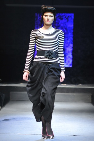 O tinuta casual, cu un aer extravagant datorita fustei lungi drapate.Nuanta dominanta a colectiei, negru este asociata cu bluza in dungi monocrome.