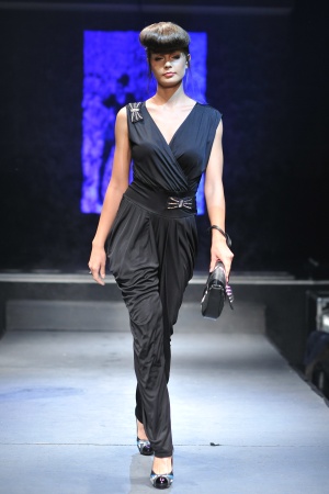 O salopeta eleganta si sexy, ideala pentru orice eveniment special. Petrecuta in fata, marcheaza talia printr-o banda lata din acelasi material. Este accesorizata cu doua fundite simple si o geanta mica.