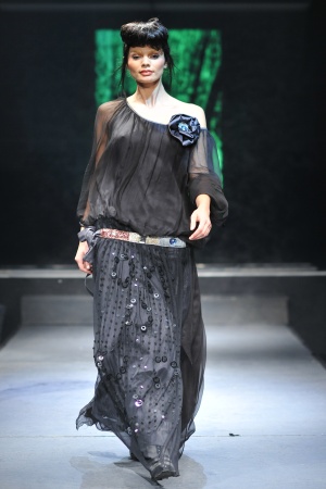 Elementul cheie al colectiei, rochia este redata prin forme cat mai ample, feminie. Acest model este realizat dintr-un material fluid contrastant. Simplu in partea de sus iar fusta este brodata cu paiete fine.