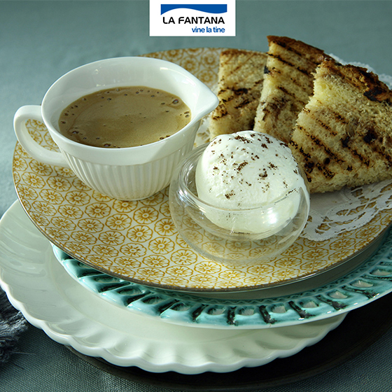 Ingrediente pentru 6 portii: 200 ml de espresso, 30 ml lichior, 6 galbenusuri de ou, 120 gr de zahar brun, 6 felii de Panettone, 260 ml de inghetata cu lapte