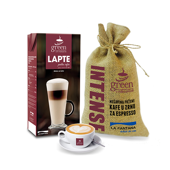 Impreuna cu sloganul “E in natura ta”, Green este un brand care isi propune redobandirea lucrurilor esentiale si simple, de la cele care provin din natura pana la cele care fac parte din noi si care ne readuc energia de a ne bucura de viata. „Green – Cafea boabe pentru espresso” reprezinta un amestec de sortimente de cafea de cea mai buna calitate din diverse regiuni ale lumii, care beneficiaza de maiestria si expertiza artizanilor italieni in selectia si prajirea cafelei. „Green – Lapte special pentru cafea” este un produs complementar pentru retete de cafea cu lapte. Datorita continutului ridicat de proteine (3,6%), laptele Green permite realizarea spumei dense si fine, adecvata pentru retete de cafea reusite. De asemenea, acesta poate fi folosit si pentru consumul uzual.