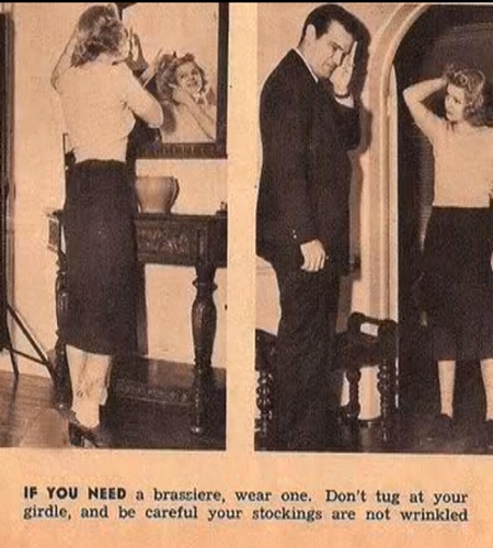 Daca n-ar fi atat de penibil, probabil ca ne-ar amuza. Dar revistele pentru femei tineau sa sublinieze importanta purtarii unui sutien. De asemenea, o doamna adevarata nici nu isi trage de burtiera si are grija ca ciorapii ei sa nu fie suciti sau scamosati.