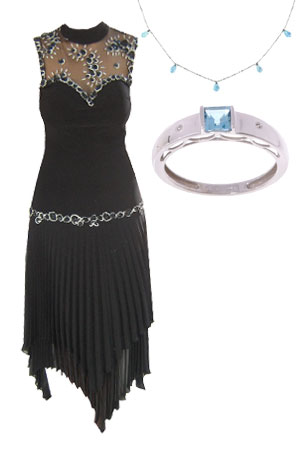 Produse: 1. Rochie de seara Roxy Fashion, 371 RON 2. limited.ro: Colier din aur alb si topaz albastru, 398.97 RON; Inel din aur alb cu diamante si topaz albastru, 264.57 RON