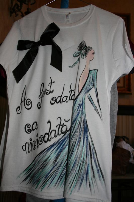 Tricou 100%bumbac. Este pictat manual folosind culori de textile. fundita de tul este cusuta de mana.