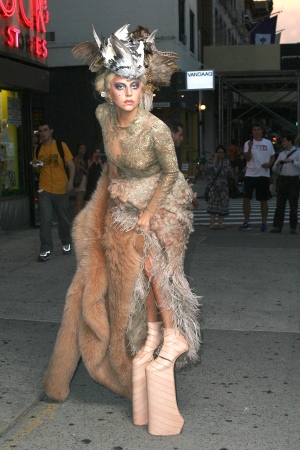 Daca-i bal, pai bal sa fie! Lady Gaga a purtat la petrecerea Vanity Fair o rochie eleganta cu dantela si pene; pana aici nimic deosebit. Punctam in schimb accesoriile: palaria cu pene, haina de blana si bineinteles, celebrii ei pantofi inalti fara toc. E ceva ce nu se potriveste?