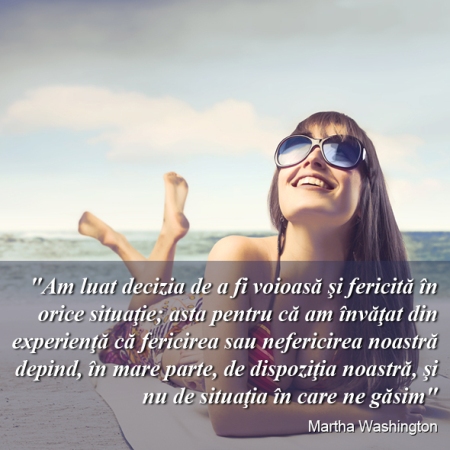 "Am luat decizia de a fi voioasa si fericita in orice situatie; asta pentru ca am invatat din experienta ca fericirea sau nefericirea noastra depind, in mare parte, de dispozitia noastra, si nu de situatia in care ne gasim".- Martha Washington