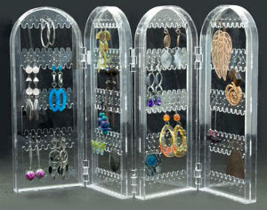 Un suport pentru cercei format din patru panouri transparente profilate din material rezistent. Capacitate 125 perechi de cercei.