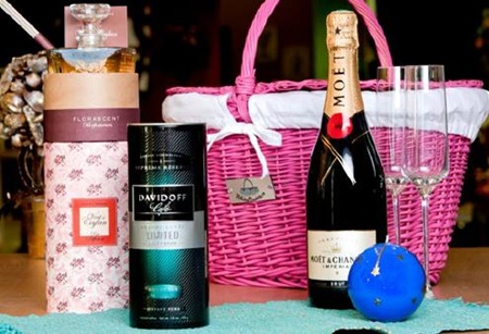 Cos cadou de Craciun cu decoratiuni si bautura