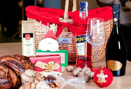 Cosul cadou de Craciun traditional din rachita impletit manual cu husa rosie contine: