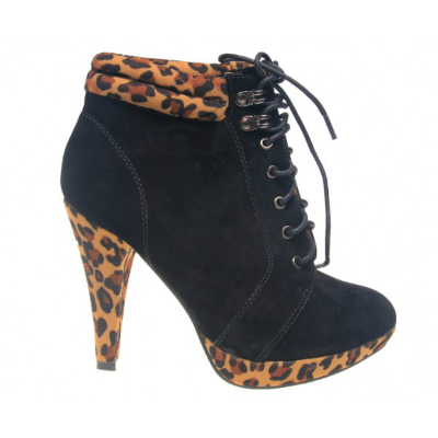 Botine de dama din noua colectie de toamna iarna 2012 confectionate din piele intoarsa avand platforma, tocul si marginile superioare cu imprimeu animalprint elegant. Inchiderea se face in partea din fata cu siret cu doua intarituri de-o partea din alta pe ultimele doua randuri.