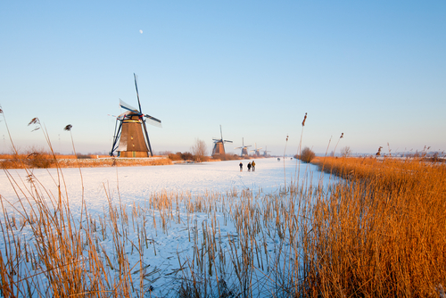 O imagine superba cu iarna acoperind un camp pe care se afla mori de vant.
