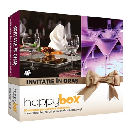 Cadoul happybox Invitatie in Oras contine 50 de experiente culinare si distractive, in restaurante, baruri, pub-uri sau cafenele din Bucuresti. De la cine romantice in restaurante de lux din capitala, la experiente culinare deosebite, cu specific italian, indian sau turcesc! happybox Invitatie in Oras contine si kit-ul necesar pentru organizarea unei super-petreceri aniversare, cu tort si sampanie, pentru grupuri de pana la 10 prieteni! Pentru cei care sunt mereu sufletul petrecerii si nu pot rata nici o ocazie de sarbatoare, aceasta cutie este cadoul ideal! O selectie de cocktail-uri si bauturi atent alese, care sa va asigure starea de spirit potrivita pentru o noapte de neuitat!