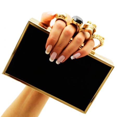 Inele spectaculoase, pe post de maner, o forma dreapta, cu piele neagra, croco, dimensiuni reduse, perfect pentru o seara in care tu si totul in jur, veti straluci.