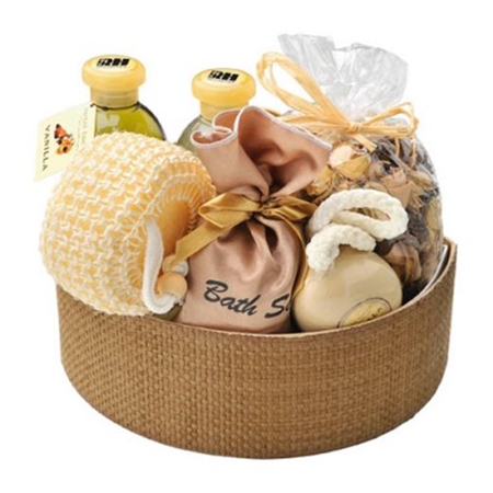 Setul de baie contine gel de baie 270ml, gel de dus, burete scrub, sare de baie si sapun, toate cu aroma de vanilie, ambalate intr-un cosulet . Este cadoul ideal pentru femeile care adora sa se relaxeze si sa isi ofere un rasfat spa in intimitatea casei.