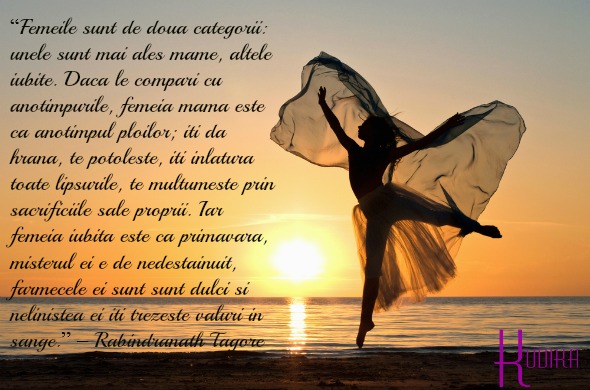 “Femeile sunt de doua categorii: unele sunt mai ales mame, altele iubite. Daca le compare cu anotimpurile, femeia mama este ca anotimpul ploilor; iti da hrana, te potoleste, iti inlatura toate lipsurile, te multumeste prin sacrificiile sale proprii. Iar femeia iubita este ca primavara, misterul ei e de nedestainuit, farmecele ei sunt sunt dulci si nelinistea ei iti trezeste valuri in sange.” – Rabindranath Tagore