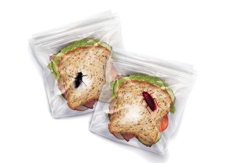 Cu totii am avut candva colegi care se abonau la gustarile noastre. Cu totii ne-am gandit la fel de fel de metode sa-i descurajam, de la sandvisuri fara umplutura si pana la ascuns pranzul in spatele frigiderului. Acum poti descuraja pofticiosii mult mai usor, fara sa faci nici un efort. Setul de pungi anti-furt pentru sandvis iti pastreaza mancarea proaspata (datorita benzii sigilabile) si neatinsa (datorita gandacilor si mustelor infricosatoare cu care sunt imprimate).