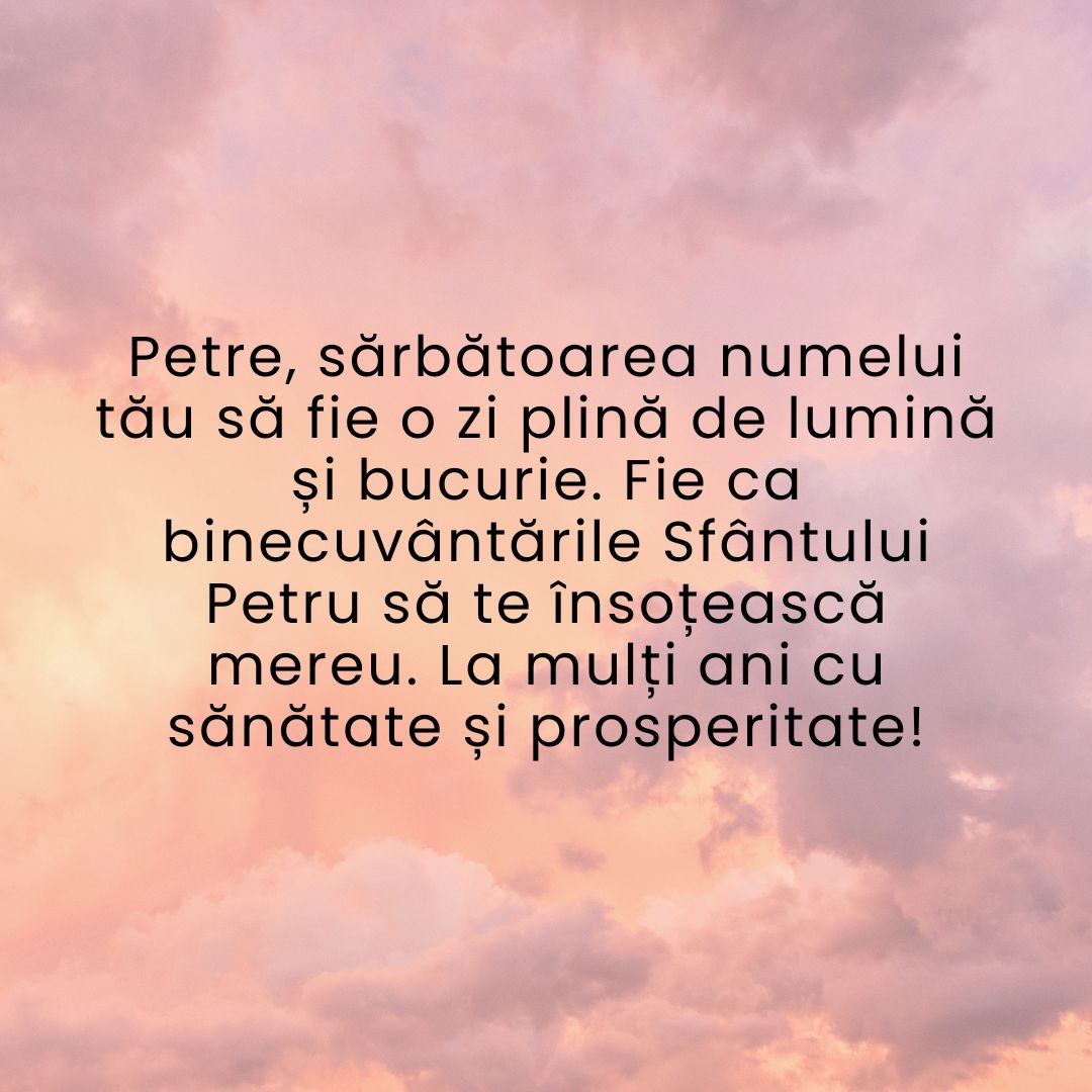 Dragă Petru, sărbătoarea numelui tău să-ți aducă pace în suflet, iubire în inimă și prosperitate în viață. Fie ca Sfântul Petru să te ocrotească și să te călăuzească mereu. La mulți ani!