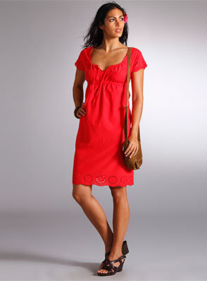 Rochie Autre O alta rochita frumoasa de vara intr-o culoare puternica: rosu aprins. Are o croiala moderna, cu decolteu generos care se poate lega cu un snur. Este decorata la maneci si pe margini cu o broderie englezeasca. Snurul de sub bust fixeaza rochia, evidentiind silueta.