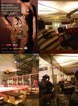 5 noiembrie – Noaptea Devoratorilor de Publicitate s-a mutat in Barul Vesper, un exil in Rahova pe care multi nu au vrut sa il sufere alaturi de faimosul maraton de reclame. Prima seara a best-of-ului organizat sub egida lui Dan Chisu a inceput nu la 22:00, ci la 23:00 – din cauza unor probleme tehnice, a sunat explicatia. Dar, judecand dupa scaunele ramase goale pe tot parcursul evenimentului, nu putine la numar, conceptul de “sushi bar” de reclame nu a fost pe gustul multimii – romanii nu au apetitul japonezilor, pare-se :) Oricum, promisiunea ca in fiecare seara, de luni pana joi, se vor vedea reclame noi poate ca va scoate afara din casa mai multi amatori de clipuri amuzante, pe masura ce lumea incepe sa prinda de veste.