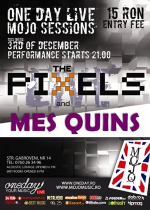 Azi continua Mojo Sessions in clubul de pe Gabroveni 14, One Day aducand in prim plan alte doua trupe indie care scot nasul la suprafata din desisul anonimatului – sa le dam, deci, o mana de ajutor ca sa se salte cu totul in ochiul public. Caci ambele merita atentia noastra, atat The Pixels, cu sound-urile lor electro si new-wave cat si Mes Quins, care mesteresc un synthpop aparte in peisajul nostru muzical.