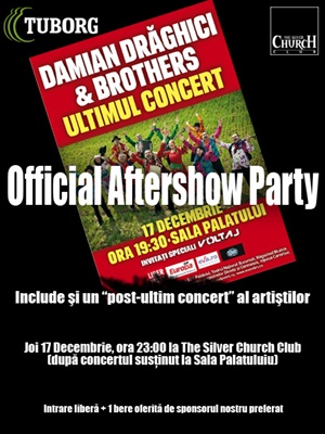 Azi, ultimul concert al lui Damian Draghici & Brothers are loc la Sala Palatului – nu va inghesuiti la casa de bilete, e deja sold-out... dar clubul Silver Church organizeaza un after-party cu intrare libera, o bere Tuborg din partea casei si un “post-ultim concert”. Acolo probabil ca va mai puteti insinua!