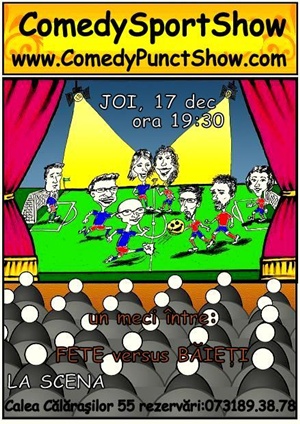 Azi e seara comica anuntata in La Scena. Comedy Sports Show, prezentat umoristic ca singurul sport unde fetele concureaza impotriva baietilor, consta dintr-un concurs de improvizatie suta la suta. Rezultatul il decide publicul, la capatul unui meci “comic ca orice emisiune tv, mai antrenant ca orice derby de fotbal” – dar se stie din oficiu ca distractia e garantata.