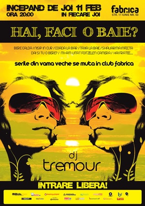 Tot joi, si tot de la 20:00, in Club Fabrica, se da startul “serilor din Vama Veche”. Ca un raspuns raspicat la vremea de-afara care numai la mare si soare nu ne da ghes sa ne gandim, Fabrica isi intituleaza initiativa indrazneata “Hai, faci o baie?” Nostalgicilor care jinduiesc dupa “atmosfera de baut o bere, de stat cu pretenii de vorba, de dansat sau de contemplat” nu prea li se da de ales, mai ales ca intrarea e libera – ca pasarea cerului, aia care nu mai zboara demult in Vama, dar de care ne amintim cu drag, joi, in Fabrica.