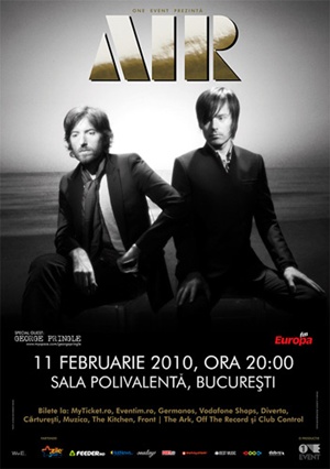 Dar pana sa ajungem la caruselul ametitorului Valentin, nici joi nu stiu cum o sa va descurcati cu alegerea care se preconizeaza una cu probleme. In primul rand, de la 20:00, e concert AIR la Sala Polivalenta, duo-ul electro care tonul muzicii cool in Franta, pe care ii puteti auzi si pe coloana sonora a bijuteriei cinematografice “Virgin Suicides”, si, deci, pe care nu va puteti permite sa-i ratati la prima lor aparitie live in Romania.