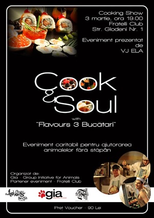 Miercuri de la 19:00, in Club Fratelli, se gateste: "Cook & Soul", un spectacol culinar, se va lasa cu degustari, cu invitati din stratosfera lumii "bune" si un scop caritabil care te va usura de 70 de Ron (mai mult daca nu te grabesti sa cumperi bilet pana pe 1 martie). VJ Ela va fi MC-ul evenimentului organizat de Group Initiative for Animals - acum ati inteles motivul altruist din spatele event-ului? Nu ca dorinta de a-ti infige dintisorii in minunatiile gatite de "The Flavours 3 Bucatari" ar trebui deghizata neaparat cu o cauza meritorie - dar afla ca fondurile stranse vor fi folosite in campanii de rescue, adoptii si sterilizare.