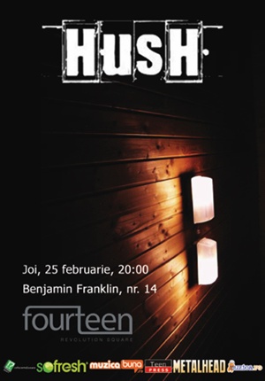 Tot azi, de la 20:00, trupa Hush va concerta in Club Fourteen de pe Benjamin Franklin 14. Nascuta in 2008 in formatie de 5 baieti cu inima de rockeri, Hush isi descriu sound-ul ca metal alternativ si tin sa mentioneze ca s-au mentinut in topul preferintelor CityFM, ceea ce, in lipsa unui profil pe MySpace unde i-am putea asculta, ne duce cu gandul la armonii muzicale demne de-o prima auditie live in formatul propus de Fourteen. Asteptam mai cu seama acele “melodii acustice” in care ni se promit clape care indulcesc metalul.