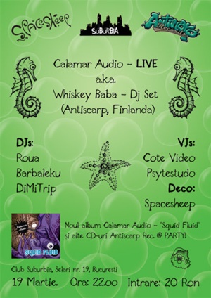 Tot vineri, in Suburbia de pe Selari 19, vor rasuna sunete subacvatice, via Finlanda, in cadrul evenimentului Underwater Love. Psihedelicul proiect Calmar Audio al lui DJ Whiskey Baba, se va da in stamba cu un set live de techno si trance. DJ-ii serii vor fi Djane Roua, Barbaleku si DiMiTrip, VJ-ii - Cote Video si Psytestudo, iar fanii vibratiilor din abisuri se pot astepta sa le fie testate “abilitatile de scafandri si amfibieni”.