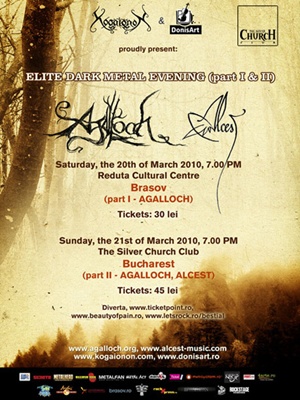 Duminica, de la 19:00, in Silver Church, metalistii din toate colturile Capitalei si nu numai au intalnire cu trupa americana de dark metal Agalloch. Un eveniment marca Kogaionon & DonisArt, Elite Dark Metal Evening ne-a pregatit un opening act nemaivazut, francezii de la Alcest fiind invitati sa cante live pentru prima oara in relativ scurta lor viata ca formatie. Metal-ul abordat de ei, nuantat cu elemente de black shoegaze, va fi urmat pe scena de main act-ul Agalloch, o formatie cult care insa nu iese la rampa atat de des cum ar cere-o acest status sau baza de fani.