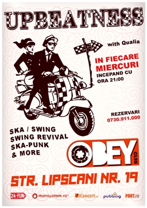 Tot miercuri, dar in fiecare miercuri de-acum incolo (pana la o noua idee, presupun), de la 21:00 in club Obey din Lipscani 19 se incinge o petrecere cu sound-uri ska, swing, ska-punk si swing revival, poreclita “Upbeatness”. Adica “binedispunere” pe ritmuri nebune,nebune!