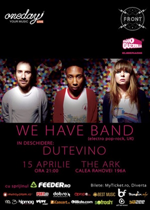 Si, tot joi, formatia britanica We Have Band, pentru a doua oara in Bucuresti, va concerta pe scena Ark-ului, in Rahovei 196A. Un trio care debordeaza de optimism printr-un melanj de indie cu accente electro si synth-pop, ei se vor da peste cap sa ne epuizeze cheful de dans de la 21:00 si pana cand ii lasam sa plece. Probabil dupa un bis lung si promisiunea revenirii. In deschiderea WHB, romanii de la DuteVino vor incalzi scena si seta atmosfera pentru rock-ul de factura britanica cu un miniconcert funk-alternativ.UPDATE: concertul a fost anulat caci baietii nu pot decola din Marea Britanie, din cauza conditiilor meteo :(