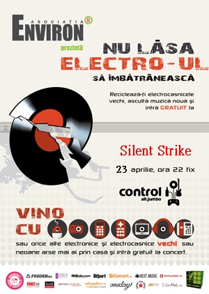 In Club Control, Environ iti ofera cea de-a doua si ultima ocazie sa-ti arunci in mod ecologic aparatele vechi si/sau stricate din casa. Daca aduci un obiect electronic, de orice dimensiune (miercuri s-au prezentat musterii cu bratele pline, pana si de computere rapciugoase), intri gratis la concertul Silent Strike, cu incepere de la ora 22.