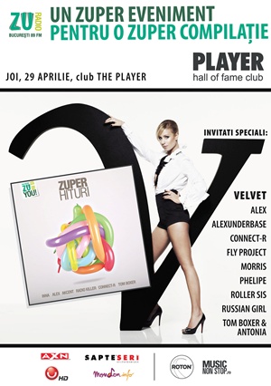 Tot joi, de la miezul noptii, in clubul The Player se organizeaza o petrecere marca Radio Zu, cu ocazia lansarii compilatiei “ZUper Hituri”. Printre artistii invitati sa anime party-ul in ciuda orei tarzii se numara Alex Velea, AlexUnderBase, Connect-R, Fly Project, Morris, Phelipe, Roller Sis, Russian Girl, Tom Boxer & Antonia. Insa capul de afis il tine solista suedeza Velvet, care promite publicului roman un concert doldora de surprize, muzicale si nu numai!