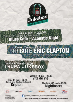 In Jukebox, sfarsitul de saptamana se anunta focusat pe muzica de calitate: joi va fi o seara de acoustic, in cadrul Blues Cafe (de la 22:00); vineri, de la 23:00, scena se va umple pentru un concert tribut inchinat lui Eric Clapton de Florin Ochescu, Eugen Caminschi (Vama), Lucian Cioarga-Clopo (Vama), Gelu Ionescu (Vama), Mugurel Diaconescu-Deaca si Bogdan Nogy; iar sambata, trupa Jukebox, odinioara rezidenta si acum bucuroasa de-a reveni pe teren familiar, va intretine o atmosfera saltareata cu melodii rock ‘n’ roll get-beget.
