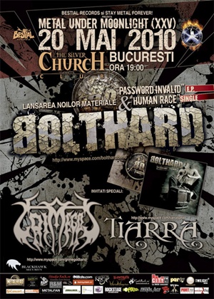 Tot joi, in Silver Church, de la 19:00, formatia de trash, death si metalcore Bolthard va lansa un EP. Noul material discografic sta sub semnul clocotirii anticipative a fanilor genului, si se numeste firesc “Password: Invalid”. Dupa un an in care s-au inchis in studio, tot de dragul nostru, baietii ne vor demonstra ca n-au stat degeaba – o demonstratie cu mostre cu tot, mai cu seama un nou single, “Human Race”. Evenimentul, inscris in cadrul serilor Metal Under Moonlight, va fi completat de supporting act-urile celor de la Grimegod si Tiarra.