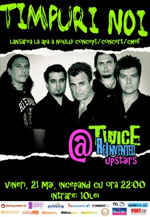 Vineri, de la 22:00, in Twice Reinvented, upstairs, adica sus in capul scarilor mai pe romaneste, formatia Timpuri Noi isi va canta muzica, si ea cat se poate de romaneasca, veterana si, odata pe vremea lui Ceasca, chiar revolutionara. Cu ocazia asta, Twice-ul mai reinventeaza ceva, si anume seara de vineri – clepsidra se va scurge mai indaratnica dupa schema noului concept, ca sa nu se faca sambata, decat cand sambata va fi cu adevarat necesara. Singurul timp de care vom mai tine cont va fi tempo-ul dictat deTimpuri Noi si cheful de dupa concert va fi e-po-cal!